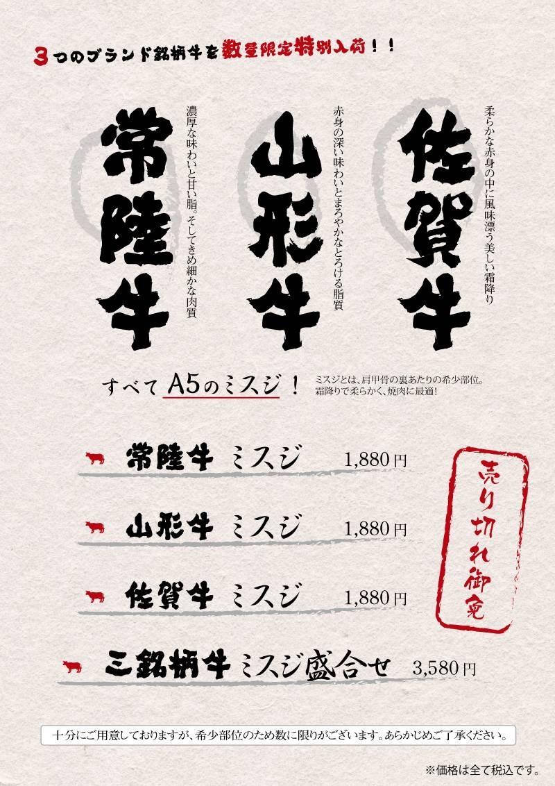 常陸牛・山形牛・佐賀牛の希少部位「みすじ」が限定入荷しました。